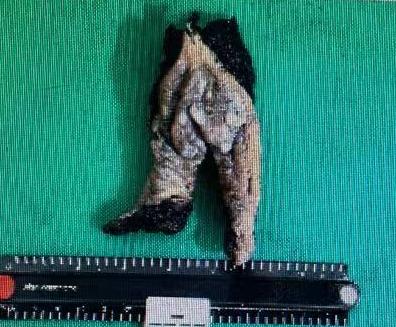 为了切除病灶,减少复发,沿着大阴唇外侧缘标记切缘,右侧缘达病灶外1.5cm,上切缘达阴蒂上方约3cm,下切缘达肛门,于小阴唇内侧切下了双侧外阴及阴蒂组织。