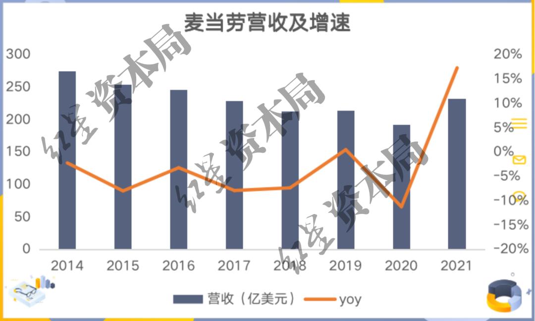 来源:公司财报、红星资本局2021年,麦当劳似乎交出了一份看似不错的成绩单。其财报显示,2021年全年麦当劳取得了232.2亿美元的营业收入,同比增长21%;其净利润达到了75.45亿美元,同比增长了59%。