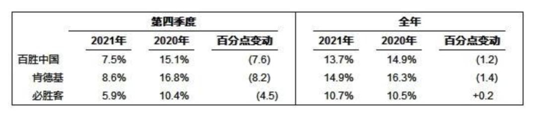 在餐厅利润率上,2021年全年肯德基利润率为14.9%,同比下降1.4个百分点;第四季度肯德基单季餐厅利润率出现腰斩,为8.6%,去年同期则为16.8%。