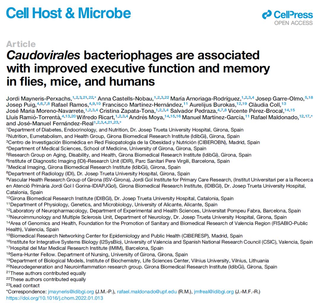近日,西班牙的多家科研机构合作,在 Cell 子刊 Cell Host and Microbe 上发表了题为:Caudovirales bacteriophages are associated with improved executive function and memory in flies, mice, and humans 的研究论文。