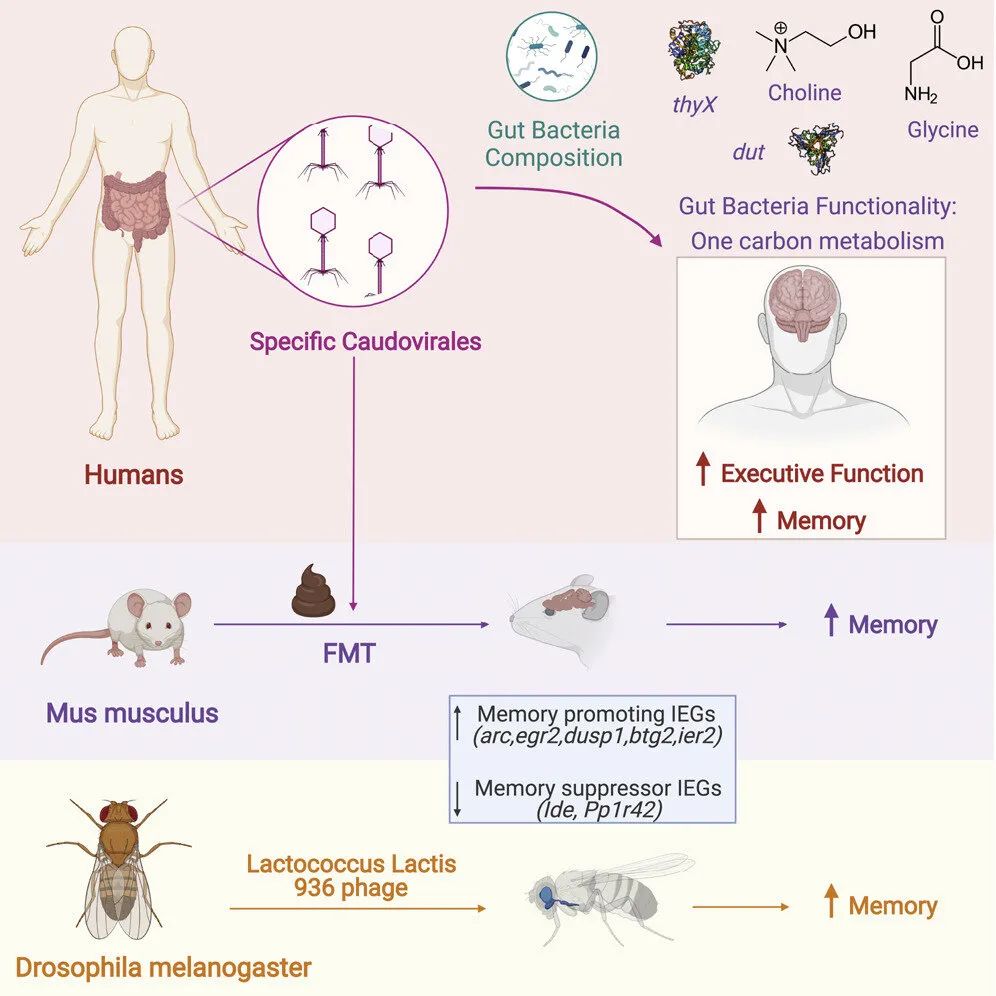 该研究发现,肠道中存在的有尾噬菌体目噬菌体可以促进果蝇、小鼠和人类更好的执行功能和记忆力。这表明噬菌体可能是微生物-大脑调控轴的新的参与者。