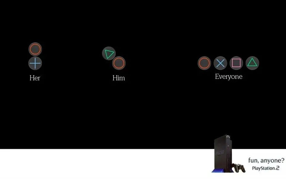 而到了PS2时期,游戏手柄上的四个按键△○x□顺势植入经典台词——“LIVE IN Y○UR WxRLD. PL△Y IN □URS.”。这组神秘代码似的图形等于PS2的代名词,一时成为电玩迷们心中的神圣符号。