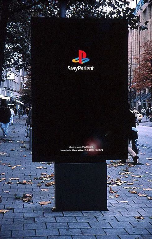 1999年,德国汉堡的一则街头广告抢先玩了文字游戏,用“PlayStation”的字体写下“StayPatient”作为预热,拉开了PS2攻占全球的序幕。