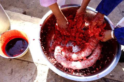 进入拌匀程序后,云南大姐就会徒手拌肉,确保每一块肉肉都能均匀地受到猪血的浸润。