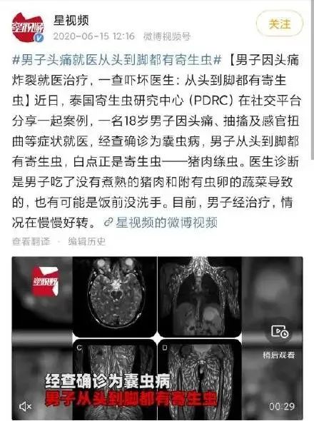 泰国一男子因头痛就医时,CT显示他的身体从头到脚都是猪肉绦虫,而原因就是因为吃了没煮熟的猪肉。
