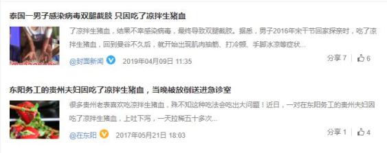 吃生猪血引发食物中毒的例子现实中也非常多,大多是云南、贵州一带。