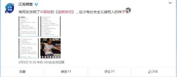 除了国外社交网站的这股清流外,中国网友也在微博上晒出了中国版蓝鲸游戏。@江苏网警称,“这才有社会主义接班人的样子”。