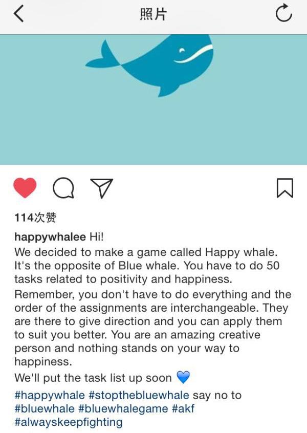 正当全民都在抵制这款死亡游戏时,国外网友“happywhalee”在社交平台INS上发起了抵制“死亡蓝鲸”游戏的“快乐鲸鱼”(happy whale)游戏,并为游戏设置了50个挑战目标。