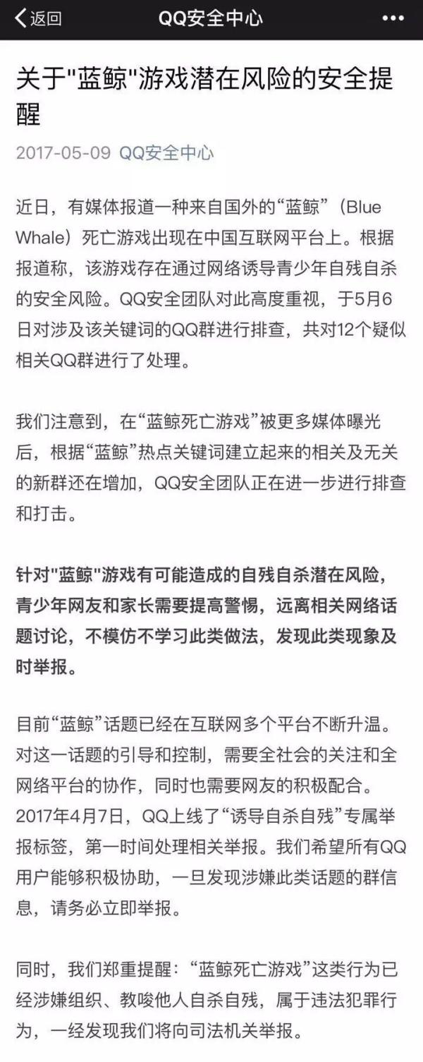 有关部门提醒,“蓝鲸死亡游戏”这类行为已经涉嫌组织、教唆他人自杀自残,属于违法犯罪行为,发现“蓝鲸”“4:20叫醒我”等字眼的社交群请报警。