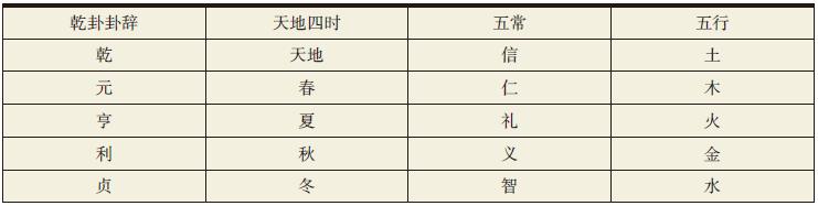 即将乾元亨利贞与天地四时、五常、五行相配,如下表: