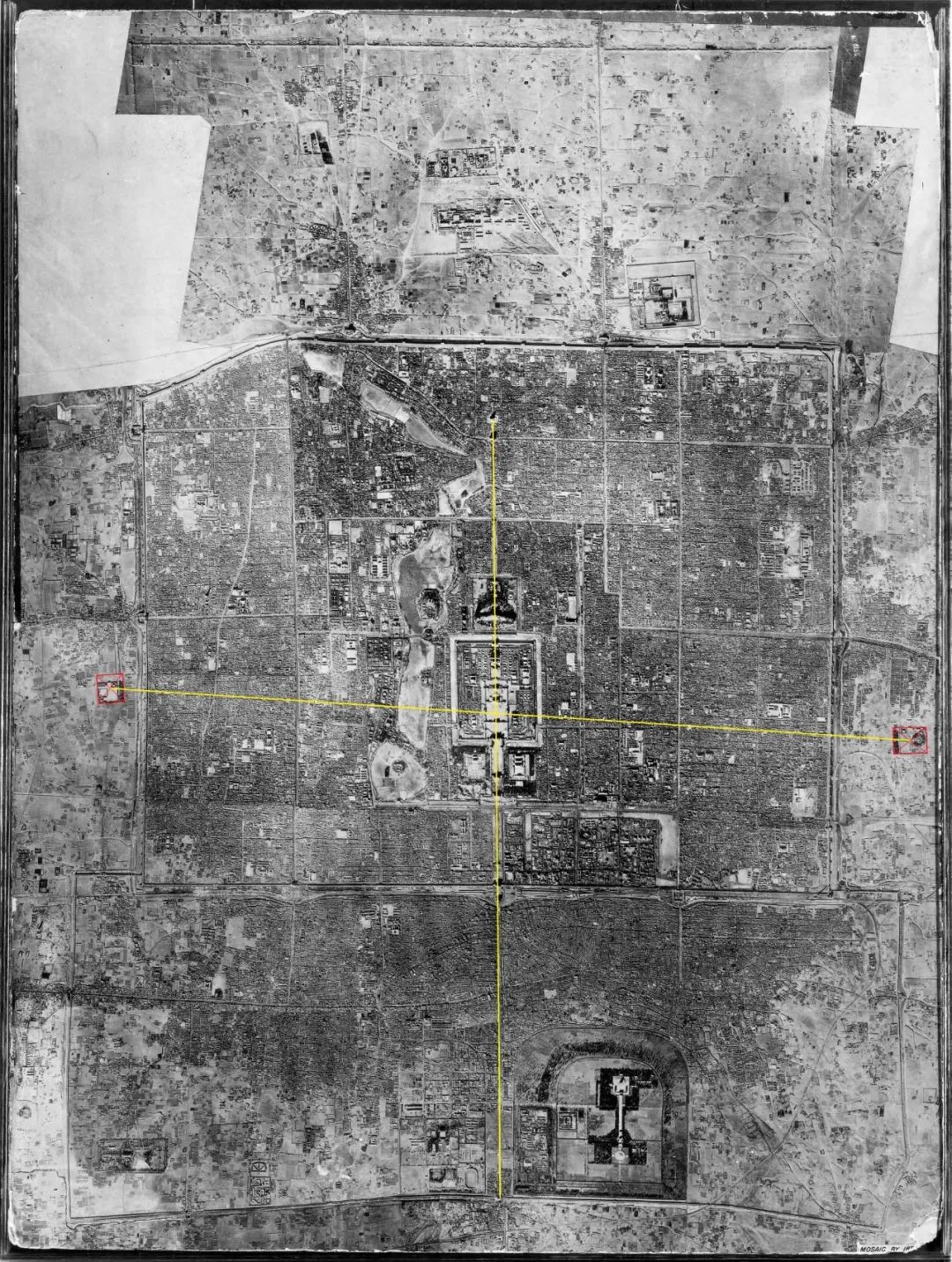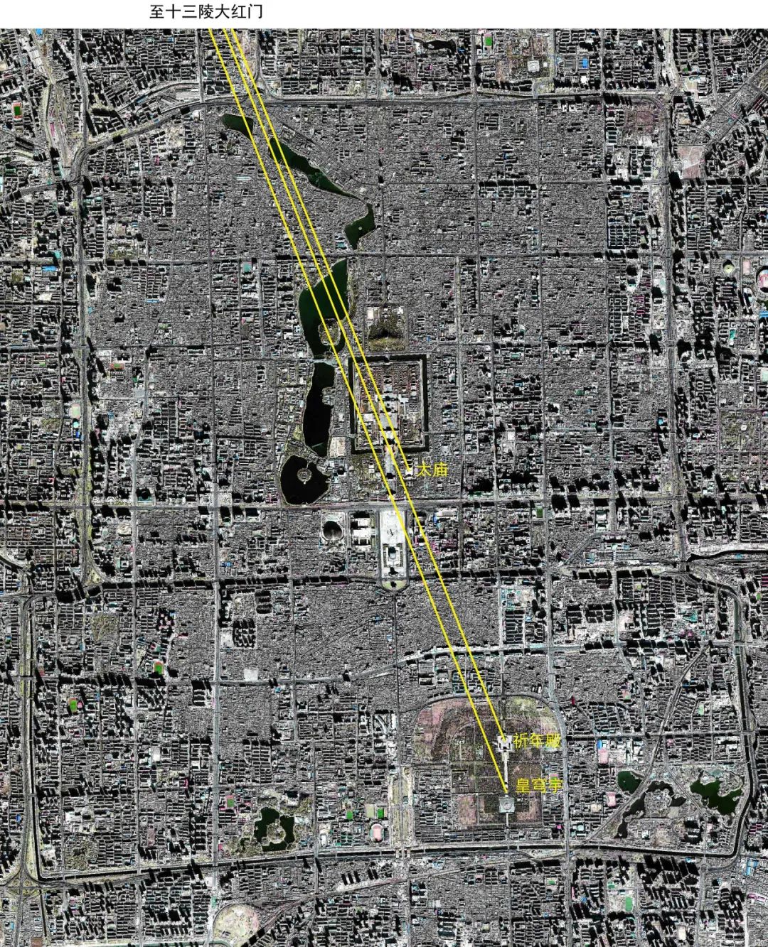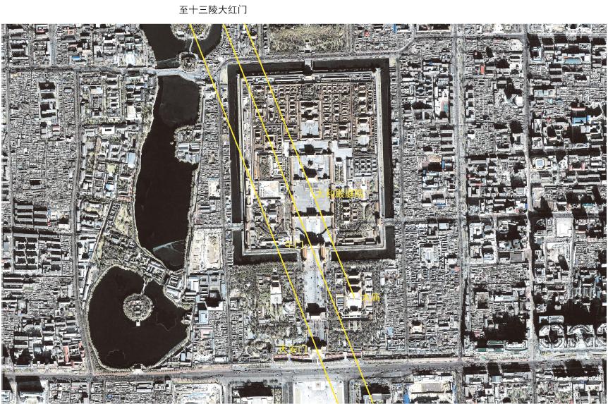 明帝陵(十三陵)大红门至太庙、祈年殿、皇穹宇建筑连线在城内分布情况。(底图来源:Quick Bird, 2003 年)