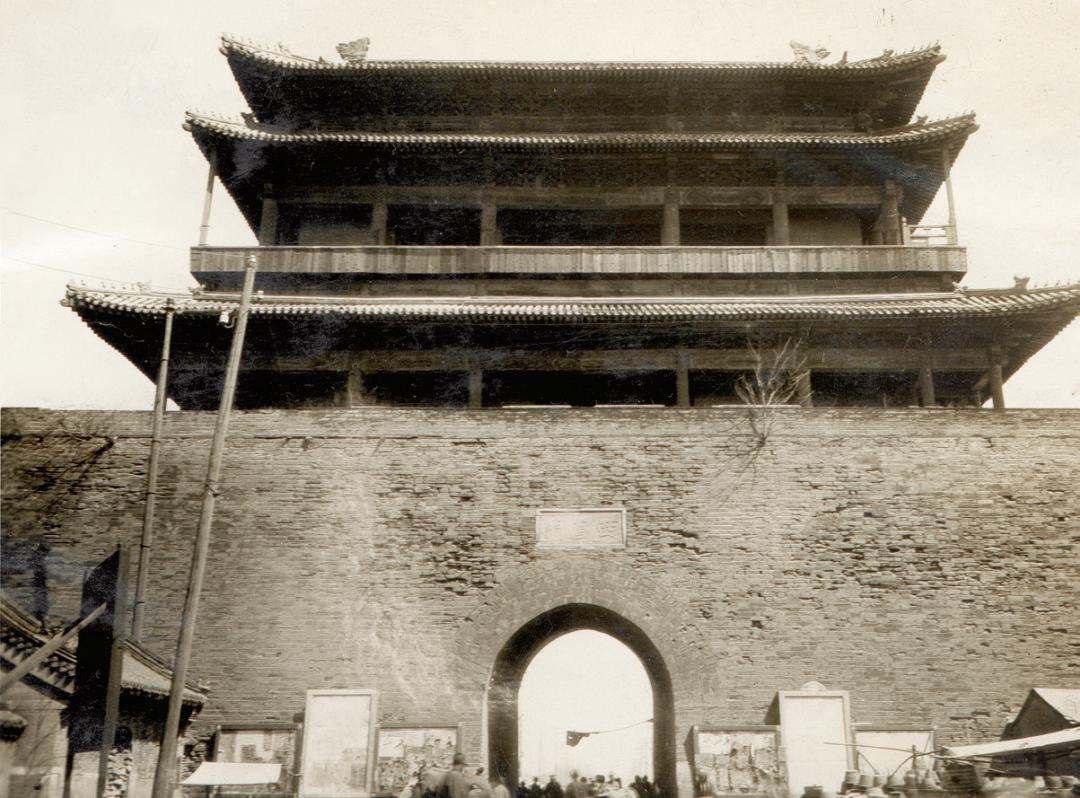 20 世纪30 年代中国营造学社拍摄的北京西直门,可见其圆券门制。清华大学建筑学院资料室提供相似的案例在明中都、明南京也可看到。明中都祭地方丘设于西北郊乾位,如同昆仑居九州乾隅与北极对应,表现了天地交通、元气化生;明中都圜丘设于南郊丙午之位,其与方丘的连接线穿过宫城平面中心,表现了“元亨利贞 ”;明中都皇陵正红门(北门)顺时针旋转,朝向东北方向的圜丘,表现了以祖配天;明中都鼓楼和钟楼的连接线,与都城中轴线交会于承天门前,形成子午卯酉格局,表现了天地四时。