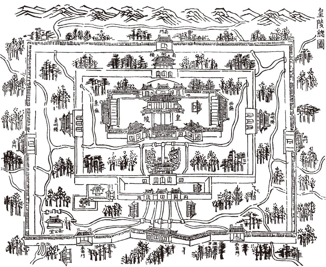 加摹《中都志》载《皇陵总图》(上南下北)显示明中都皇陵正红门向东北旋转情况。(来源:潘谷西,《中国古代建筑史》第4 卷,2009 年)明南京宫城前朝乾隅与巽隅的连接线通往太庙平面中心,表现了“元亨利贞 ”;前朝艮隅与坤隅的连接线通往社稷坛平面中心,表现了“西南得朋,东北丧朋,安贞吉”。朱元璋孝陵居都城东北艮位,总平面为北斗造型。将孝陵中轴线南端的御河桥与宫城右前方居坤位的社稷坛平面中心画线连接,宫城午门在此线上。前述明北京帝陵大红门—德胜门 —紫禁城午门 —天地坛大祀殿的建筑连线( L3)与之相似,也是将帝陵、宫城、坛庙建立联系。显然,明南京孝陵、宫城、社稷坛的这一格局,体现了以祖配天、“事死者如事生 ”、“西南得朋,东北丧朋,安贞吉 ”的意义。