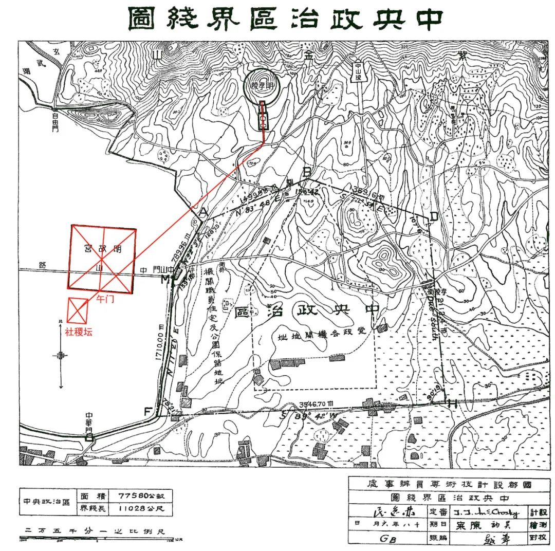 南京明孝陵、宫城午门、社稷坛分析图一。(底图来源:国都设计技术专员办事处,《首都计划》,2006 年)