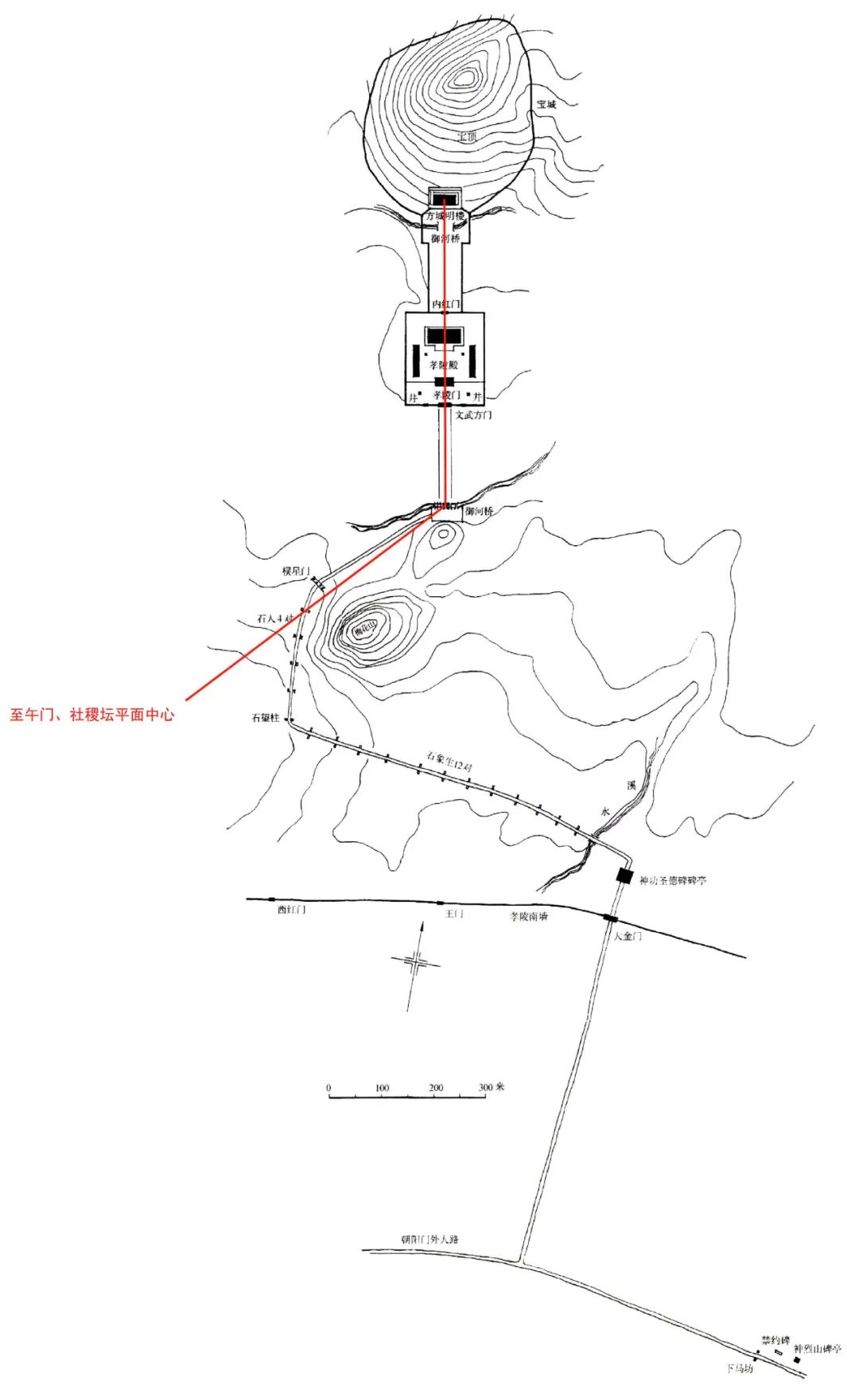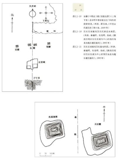 南京明孝陵、宫城午门、社稷坛分析图二。(底图来源:潘谷西,《中国古代建筑史》第4 卷,2009 年)此种规划方法,在西汉长安城超长距离的子午中线格局中也能看到。考古工作者 1995年发现的这条绵延七十四公里的子午中线, 南至秦岭子午谷口,北至天齐祠遗址,纵穿长陵、长安城,汉高祖陵与吕后陵、未央宫与长乐宫分布其两侧,陵区、宫殿、都城一体化设计,也蕴含了丰富的人文理念: