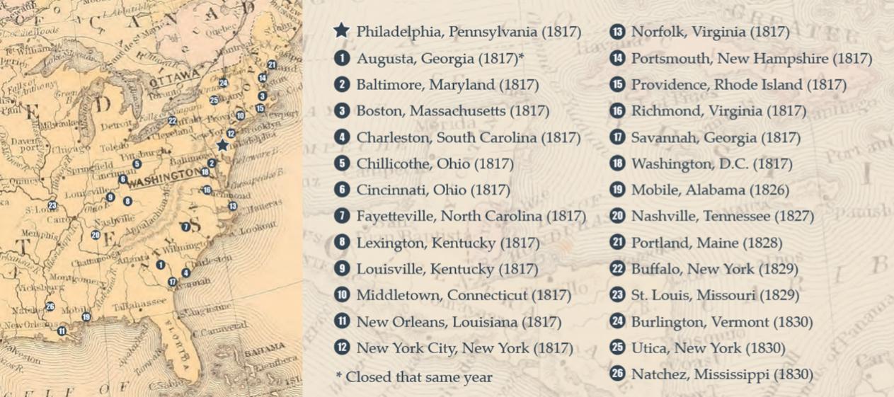 第二银行的总部仍在费城,共有25家分行(图1)。特许权有效期也是20年。总资本为3500万美元,远高于第一银行的1000万美元。规模的扩张与美国经济的发展相适应。董事会由25名董事组成,其中5名成员由总统任命并经参议院确认。股权结构保持不变:政府占比20%,私人投资者占80%——股本的25%以货币形式支付,75%以政府债券形式支付。私人股东主要是东部各州的银行家和外国投资者。其中,外国投资者的持股份额约为总股本的三分之一。通过代理持股,第二银行实际上控制在少数股东手里,股价也常被操纵,成为少数股东谋取利益的工具,致使杰克逊总统称其为“腐败的九头蛇”,也为后来的“银行战争”埋下了伏笔。