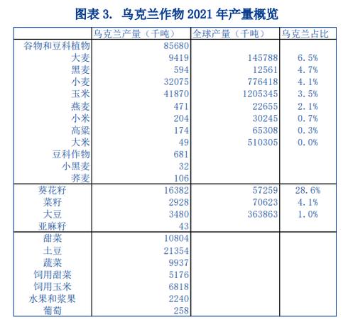 根据2021年乌克兰所有农作物的产量占比看,产量在全球占比中超过3%的谷物包括大麦、黑麦、小麦、玉米,油籽包括葵花籽和菜籽,其中葵花籽的产量占比最为突出,乌克兰是葵花籽第一大产国。