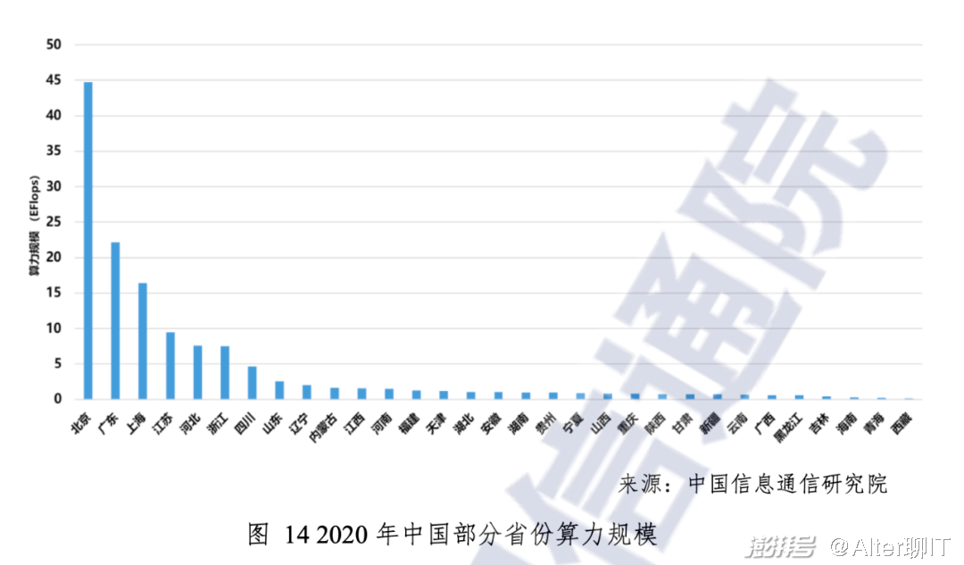 一是当前国内不同省市的算力分布。根据中国信通院在《中国算力发展指数白皮书》中给出的数据,北京、广东、上海的算力规模位列前三,浙江、广东、江苏等东部省份的算力增速超过60%,内蒙古、贵州、甘肃等省市在算力规模和增速上并不占优。