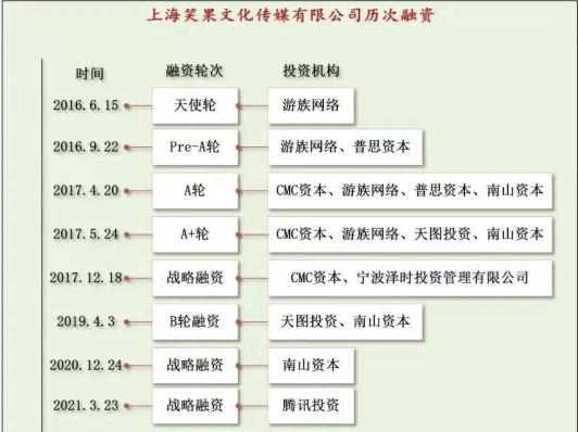 启信宝资料显示,笑果文化自2016年起有7轮融资,前后包括王思聪的普思资本、还有天图投资等布局。而最新一轮为去年3月,投资方为腾讯投资。