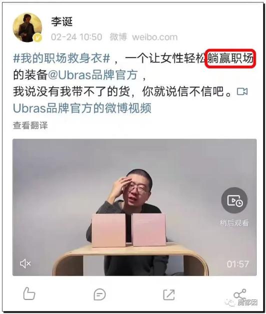 2021年2月24日,自诩“万能带货王”的李诞,在个人微博发布了一条女性内衣的营销广告,话题是#我的职场救身衣#,文案称其产品为,“一个让女性轻松躺赢职场的装备”。