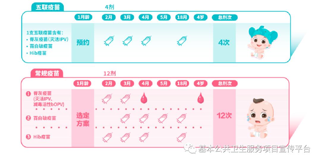 五联疫苗同时包含了百白破(百日咳、白喉、破伤风)疫苗、脊髓灰质炎灭活疫苗,和b型流感嗜血杆菌(Hib)疫苗,也就是常说的“一苗防五病” 。