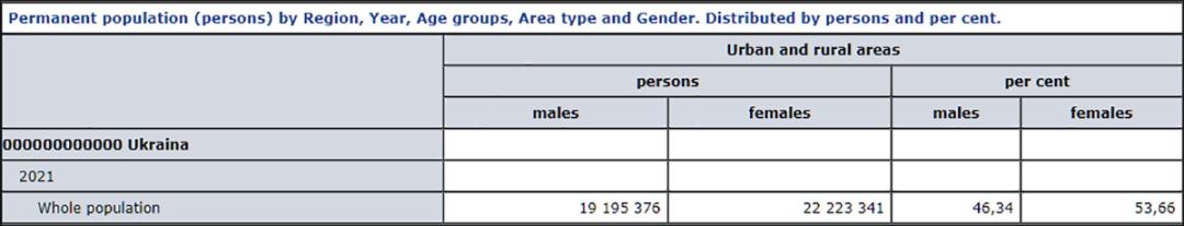 在乌克兰国家统计局的人口普查数据中,可以获取到乌克兰按照性别、地区等要素划分的人口数据。(乌克兰国家统计局注:人口统计数据的地区不包括克里米亚自治共和国和塞瓦斯托波尔市的临时占领区;人口数量(预估)依据现有官方登记的出生人数和死亡人数的行政数据计算,包括居住地的登记变化)