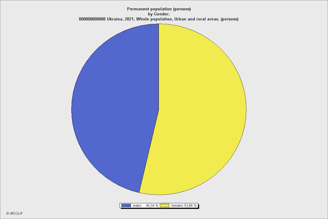 根据其数据统计,截至2021年1月1日,乌克兰人口总数为41418717人,其中男性人口有19195376人,占比46.34%,女性人口有22223341人,占比53.66%。