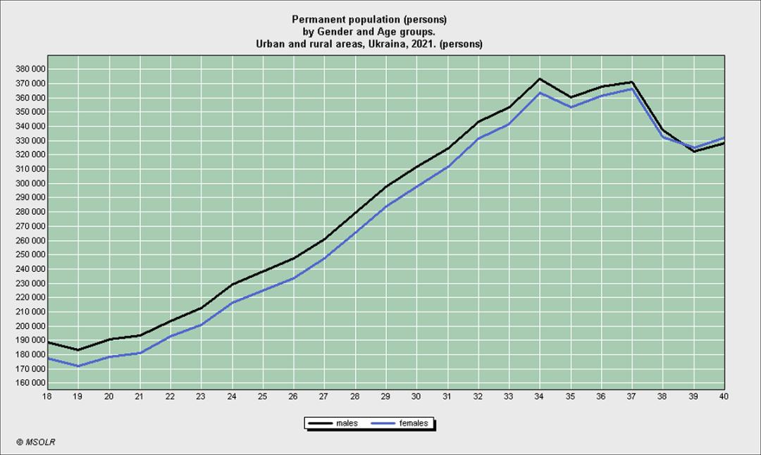 有据核查员在分析这份图表时发现:在0至38岁这一年龄段的群体中,乌克兰的人口性别比(女性/男性)(correlation f/m)维持在0.94~0.99之间,男性略多于女性,人口性别比比较均衡;