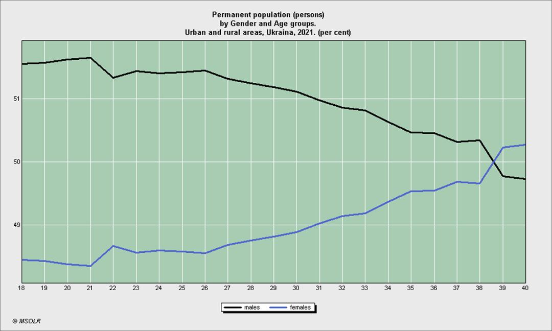 下图为乌克兰18至40岁年龄段人口的男女性别占比对比(%):