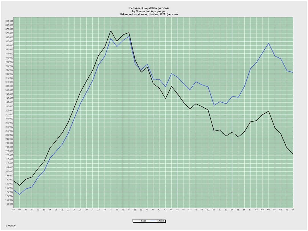 整体上,在乌克兰0至38岁的人口中,每个年龄层均为男性略多于女性;乌克兰38岁至100岁的人口中,年龄越大,乌克兰的人口性别比越为失衡。