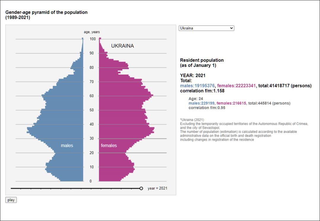 3,乌克兰人口性别比如何?乌克兰国家统计局官网还提供了一张人口年龄结构整体呈负增长型的人口结构模型图。这份图表可以更清楚地比较乌克兰的人口性别比(女性/男性)(correlation f/m)。该数值越接近1.00,说明性别比例越均衡。
