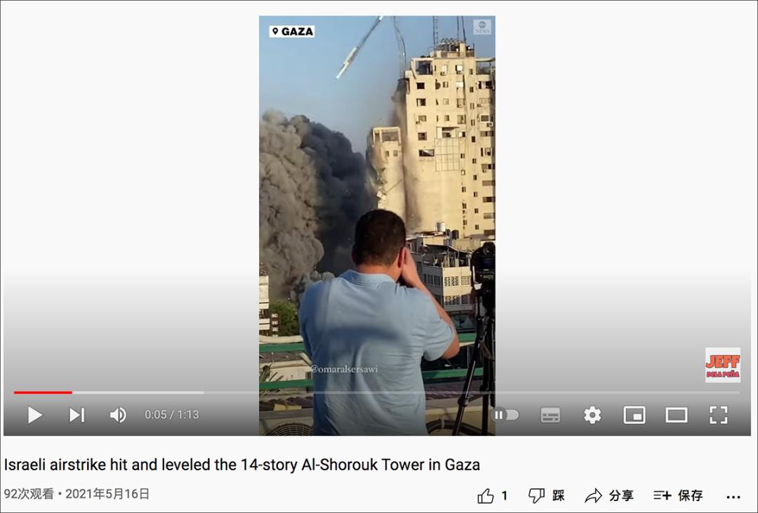 截取视频关键画面反搜,可以发现这是2021年5月以色列轰炸加沙地带南部一栋14层楼高的建筑Al-Shorouk大楼的画面,与当前俄罗斯对乌克兰发动的战争无关。