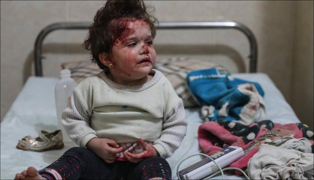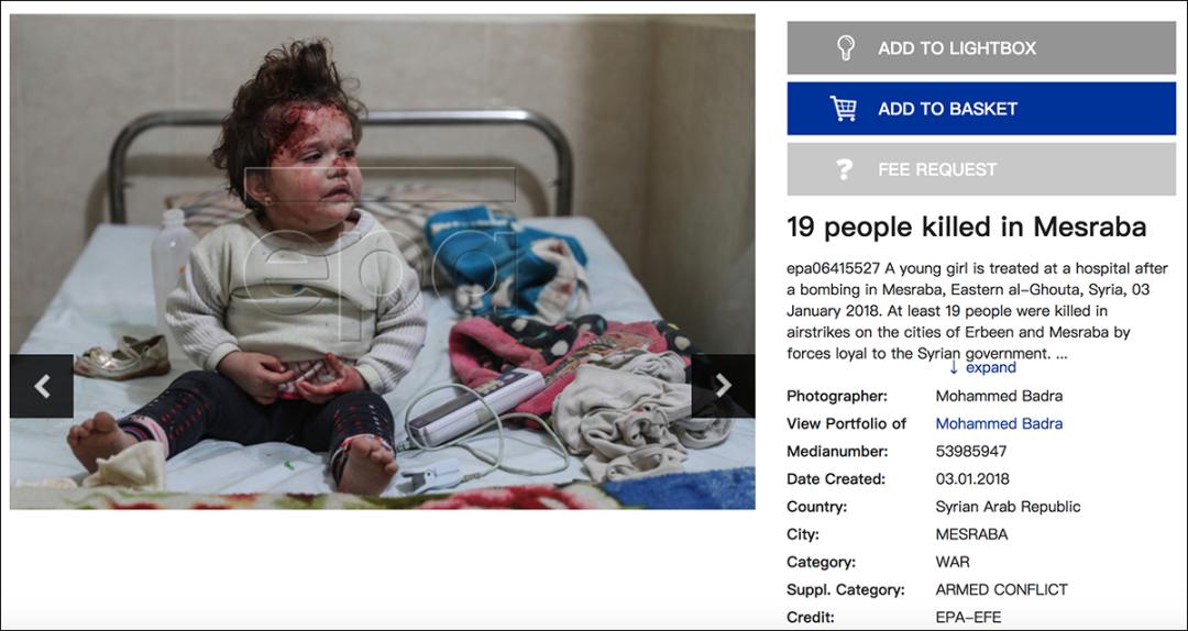 通过反向图片搜索可以发现,这张图片是欧洲新闻图片社(EPA)拍摄的,图片说明是:2018年1月3日,叙利亚Eastern Ghouta的Mesraba发生爆炸后,一名年轻女孩在医院接受治疗。至少有19人在忠于叙利亚政府的部队对Erbeen和Mesraba的空袭中丧生。