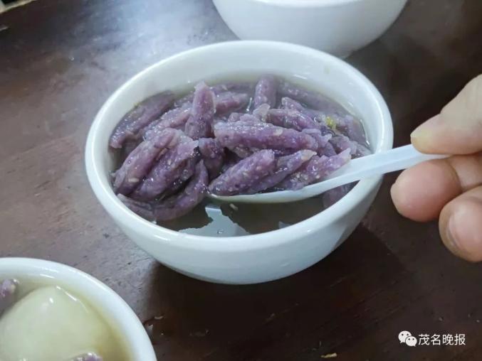 芝麻糊此外,店里的特色糖水还有小麦糖水和大薯粑子。老板用自制的工具将大薯刨削成粉,再以面粉和成团,搓成一个个两头尖尖的粑子。煮熟的大薯粑子入口弹韧,非常饱腹。