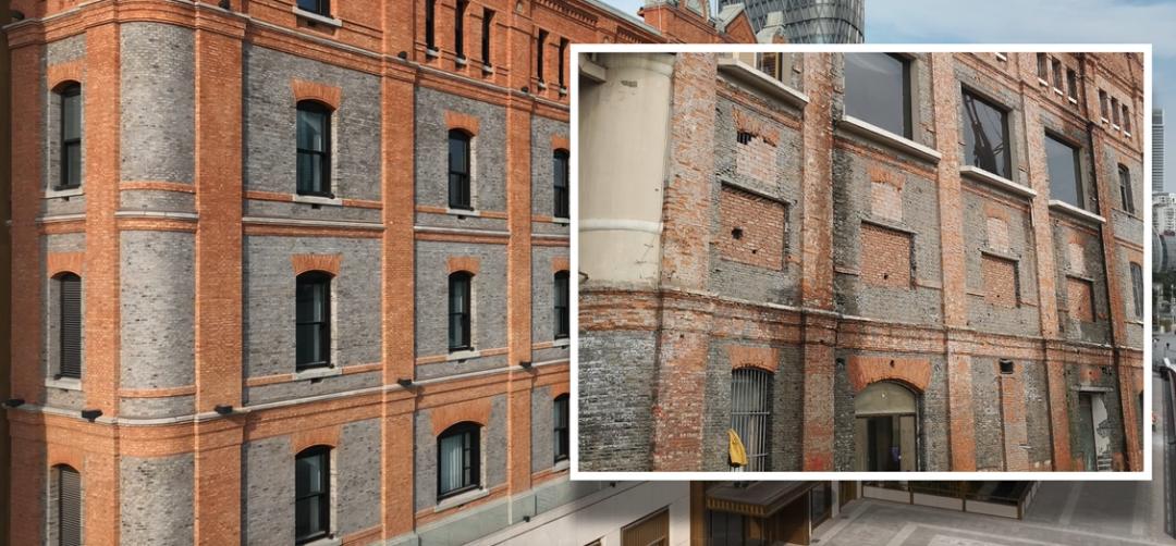 在工程启动之前,华东建筑设计研究院专业设计团队就针对扬子江码头片区进行了大量且细致的历史研究,一个细节引起了专家们的注意。“我们把现场和历史照片进行比对发现,两座建筑的轮廓和照片里的建筑有些相似。带着疑问,我们又从上海市城建档案馆调取了更详细的史料。研究发现,这两座仓库在百年前就存在,它的外墙原貌应该是清水墙。”一位工作人员表示。