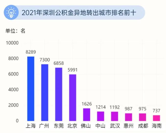 图源:公众号“深圳市住房公积金管理中心”数据显示,2021年深圳共有41779名职工将公积金迁移到其他城市,略少于迁移至深圳的外来人口(47224)。