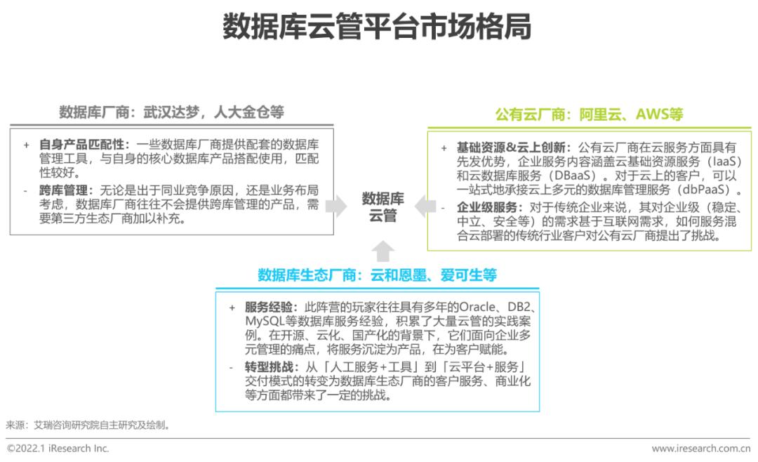 当前提供数据库云管平台产品的厂商分为三类:一类是数据库生态厂商,他们具备多年的企业数据库服务经验和实践案例积累,具备服务产品化的先发优势;一类是公有云厂商,顺接IaaS和DBaaS服务,进而为企业提供DBPaaS服务;一类是数据库厂商,在提供核心数据库产品的同时配套管理工具。各类型厂商各具优劣势,在百花齐放,多元混合的数据库市场里,各厂商关系主线体现为竞合,不同类型厂商可以在技术、经验、资源等方面互相补足,共同拓展更广泛的市场空间。