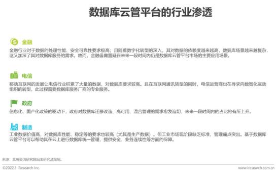 与数据库服务行业类似,现阶段数据库云管平台主要应用于对数据库性能、时延、稳定、安全要求最高的金融和电信行业。未来,随着企业数字化转型的深入,数据库云管平台的市场空间将进一步释放,向政府、制造等具备高价值属性的行业渗透,为更广泛的企业市场赋能。