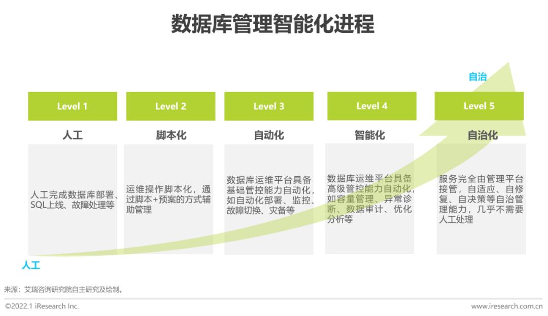 人工智能触发的产业变革将涉及所有行业,乃至以一种全新的模式重构行业和企业。随着算力愈加充裕经济,算法愈加安全高效,模型训练时间缩短,人工智能将会适应更多的应用场景。在数据库管理领域,人工智能扮演越来越重要的角色,推动数据库管理从被动支撑转变为主动赋能。当前数据库管理的智能化还更多地体现在自动化与降本提效,未来将进一步向能力增强和创新发展:在Level 5自治模式下,机器自监控、自决策、自执行,几乎不需要人工干预,一个人可以轻松管理拥有数千套数据库的大型数据中心。另一方面,人工智能与云、边缘计算、大数据等技术充分协同,改变数据库服务商业模式,人工驻场服务逐步消失,云运维行业将会出现新的服务模式。