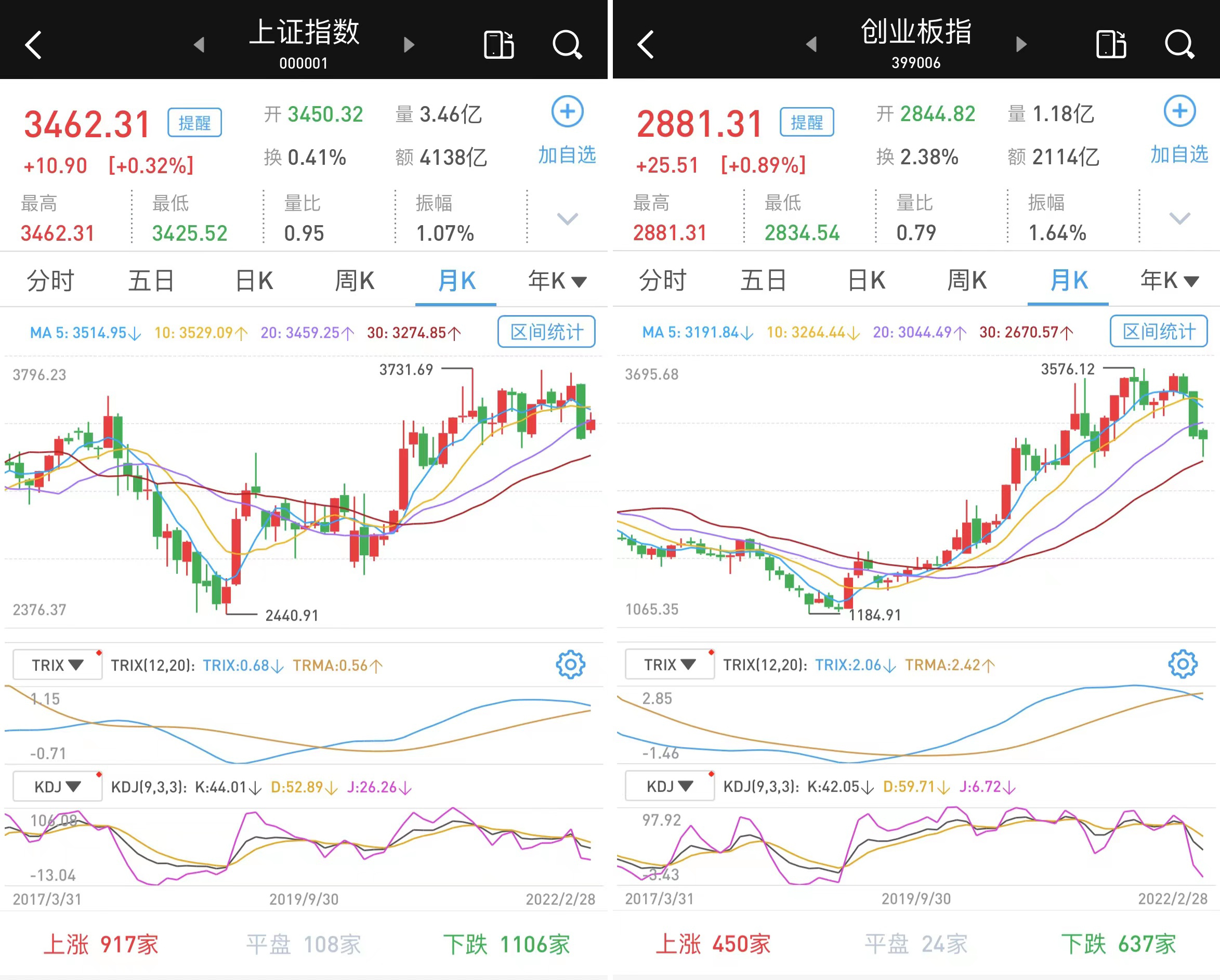 A股市场2月收官,沪指涨3%,创指跌0.96%。