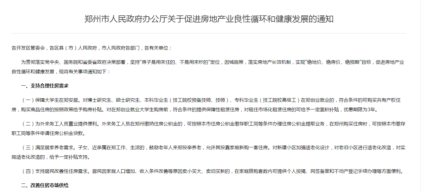 3月1日,河南省郑州市人民政府办公厅发布《关于促进房地产业良性循环和健康发展的通知》(简称《通知》)。《通知》共分为五部分,分别从支持合理住房需求、改善住房市场供给、加大信贷融资支持、推进安置房建设和转化、优化房地产市场环境五个方面提出促进郑州市房地产业良性循环和健康发展的19项措施。