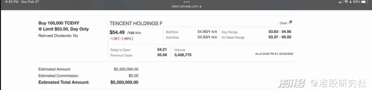 段永平回复:低过我上次买的价钱了,那明天再买点。睡前下个单,希望明天成交。并晒出一张买入腾讯ADR金额535万美元的交易单。