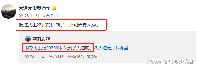 2月28日,有网友在社交媒体发评论:腾讯控股又到了大道底,并@大道无形我有型("小霸王"、"步步高"创始人、知名投资人段永平)。