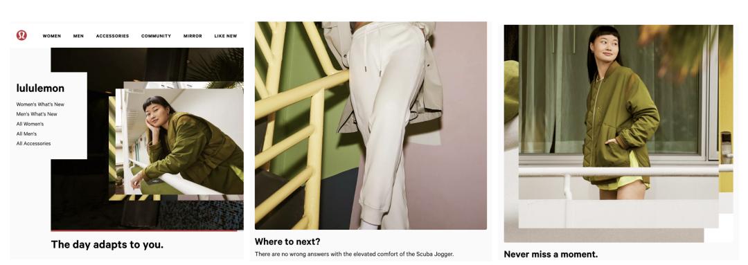 了解这一点后我们再来看Lululemon,这是Lululemon的官网首页,这一天是属于你的,你接下来要去哪儿,你不要错过任何片刻,无一不以消费者为主语。