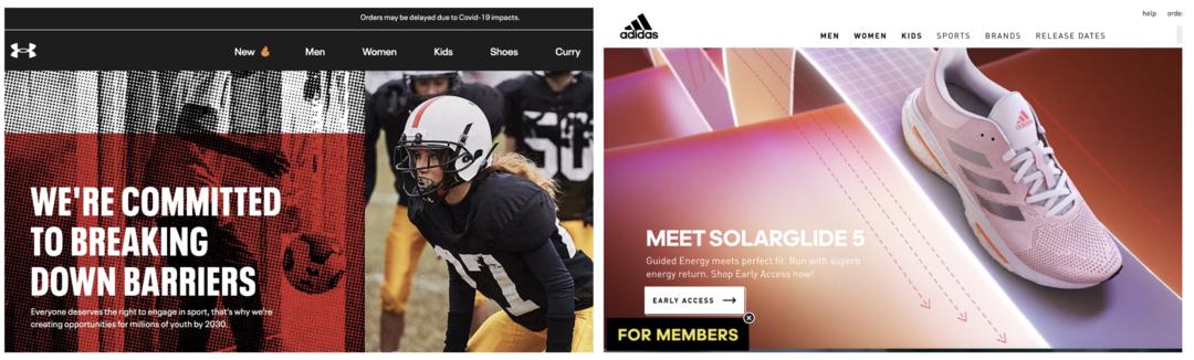 ▲Lululemon标语以消费者为主角作为对比,这是同样以运动服为主打产品的安德玛官网,一上来就是我们的使命是什么什么;这是阿迪达斯,我们最新款的鞋子blablabla。