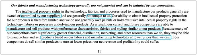 ▲Lululemon自我披露风险:不掌握专利所以一些新兴瑜伽服品牌就从产品端下手,号称能提供同款面料同款剪裁的瑜伽服,企图打造下一个Lululemon。