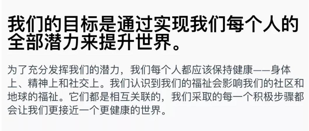 来看Lululemon的口号,提升世界,影响地球的福祉,这就把个人的健康和成长又拔高了一大截。