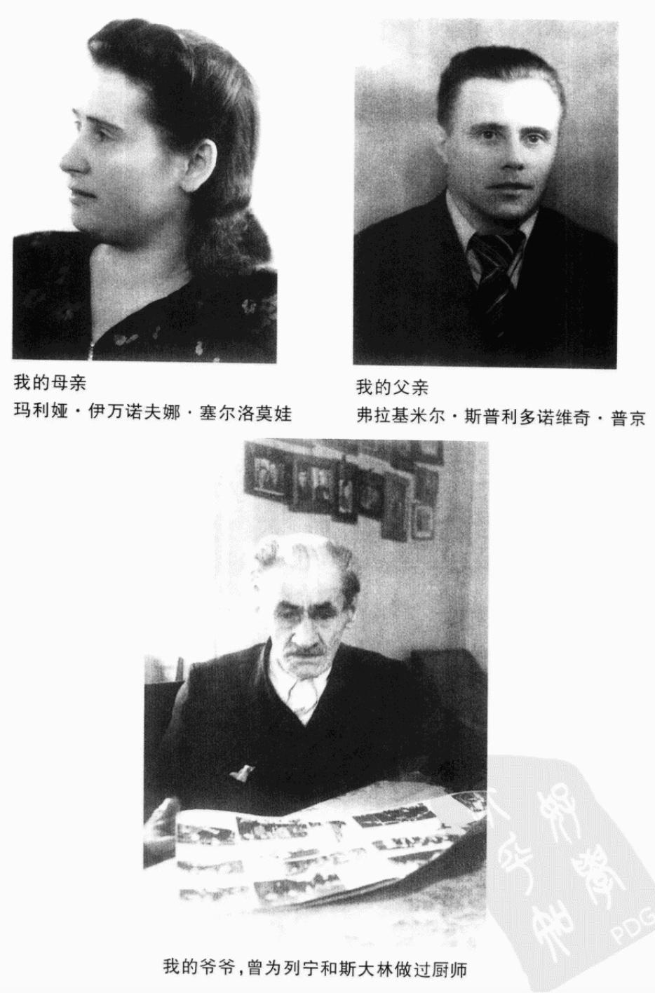 普金的母亲、父亲、爷爷他爸长相严肃,脾气暴,在普京印象中话不多,但每次家里来亲戚围桌唠嗑,普京都能听到他们对爸爸英勇事迹的描述。他爸年轻时参军,曾被敌人的手雷炸到,双腿被弹片穿透了,但还是靠意志力撑到战友来拖他走,是个十足十的狠人。