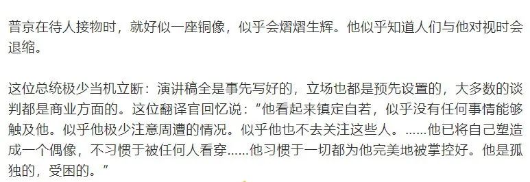 总之,在西方媒体眼里,普金是个不太好相处的人。比如,英国的 《独立报》 在发布其题为 《普京的一天》 的报道中,描述了他的记仇、自我、孤独、偶像性及掌控欲:
