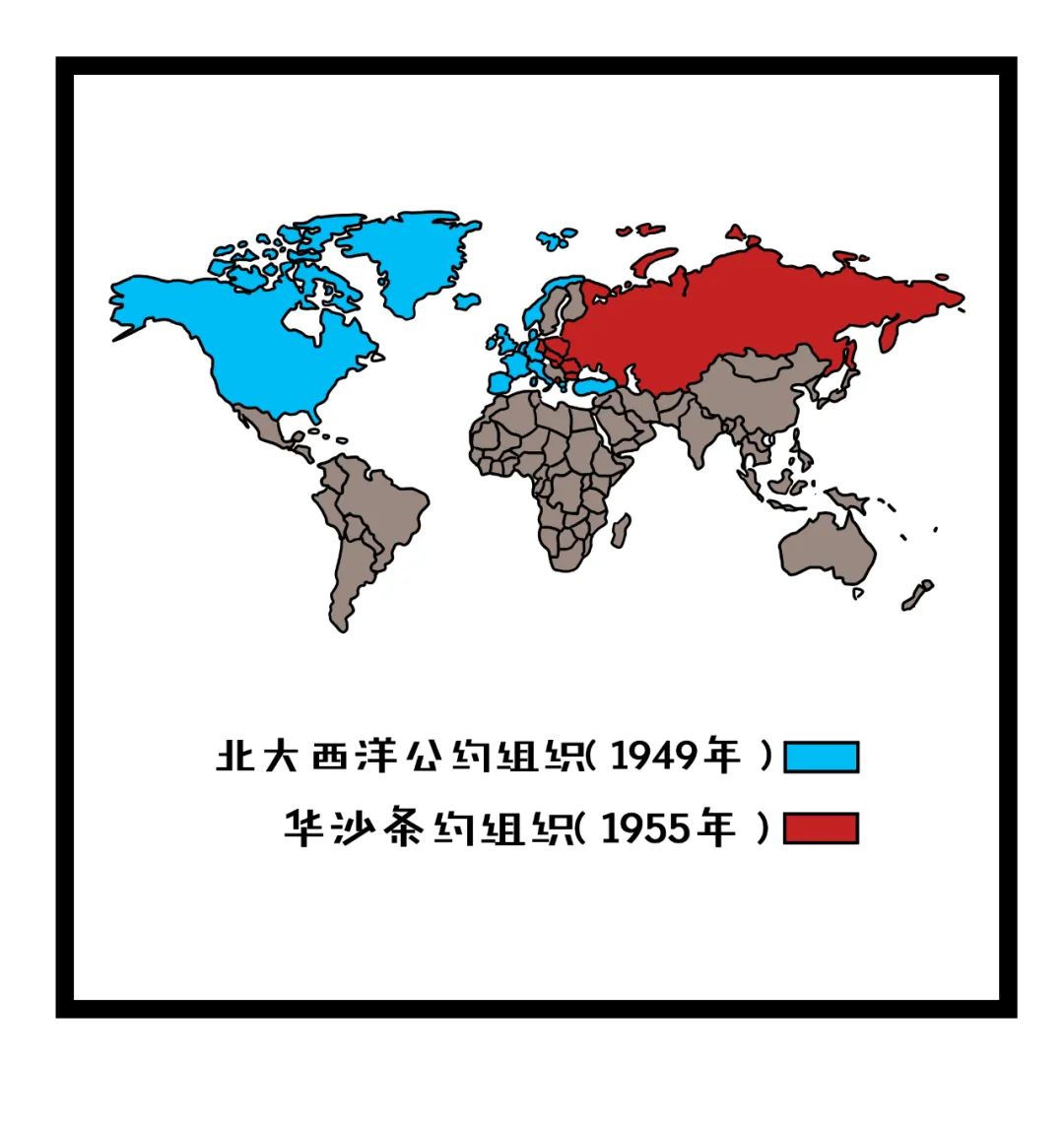 加入北约的主要是北美、欧洲西边各国;加入华约的主要是欧洲东边那一块儿。后来,这俩组织一直较劲